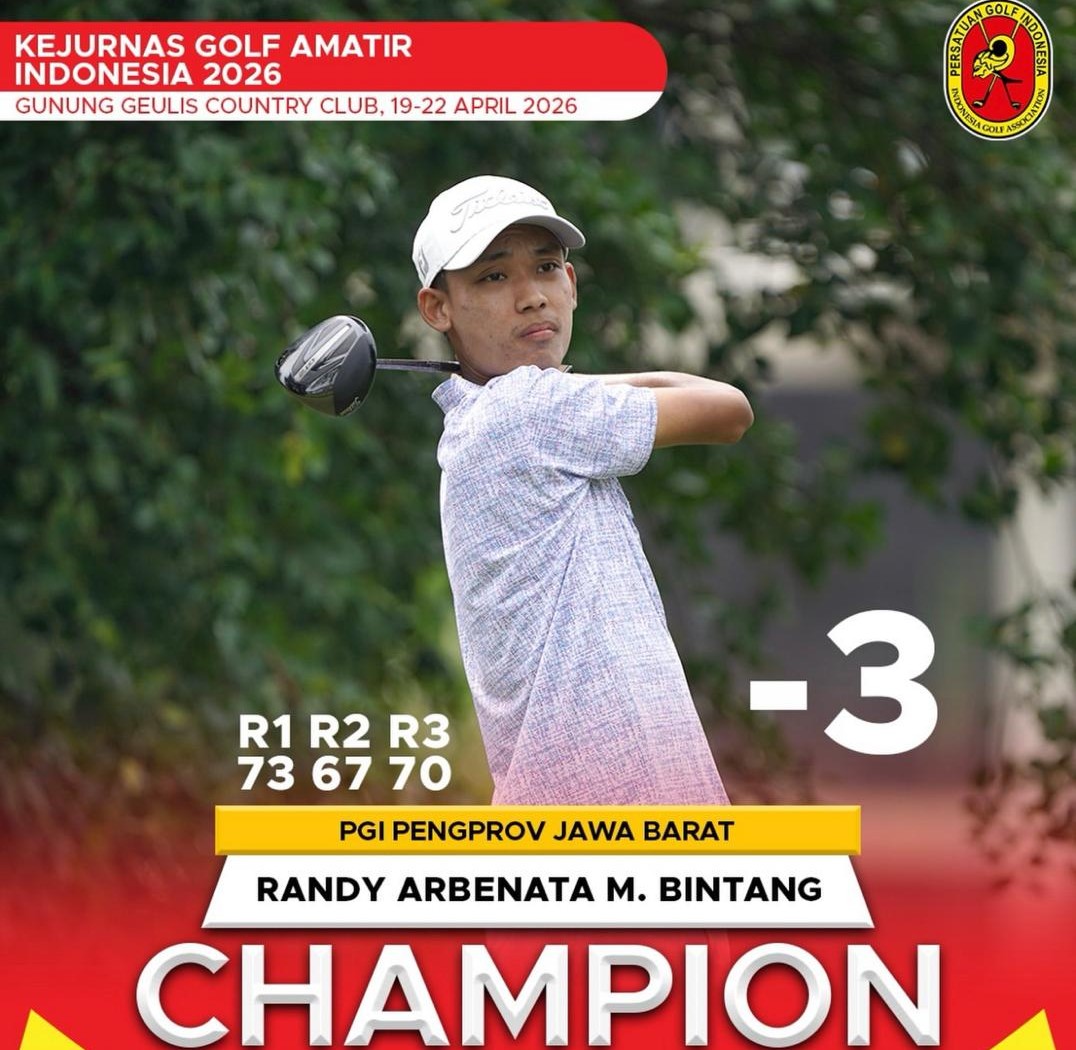 jurnalbogor.com – Pegolf putra Jawa Barat, Randy Arbenata Mohamad Bintang berhasil meraih gelar juara di Kejuaraan Nasional (Kejurnas) Golf Amatir Indonesia 2026 yang diselenggarakan oleh Pengurus Besar Persatuan Golf Indonesia (PB PGI) pada 21–23 April 2026 di Gunung Geulis Country Club (West Course), Kecamatan Sukaraja, Kabupaten Bogor.