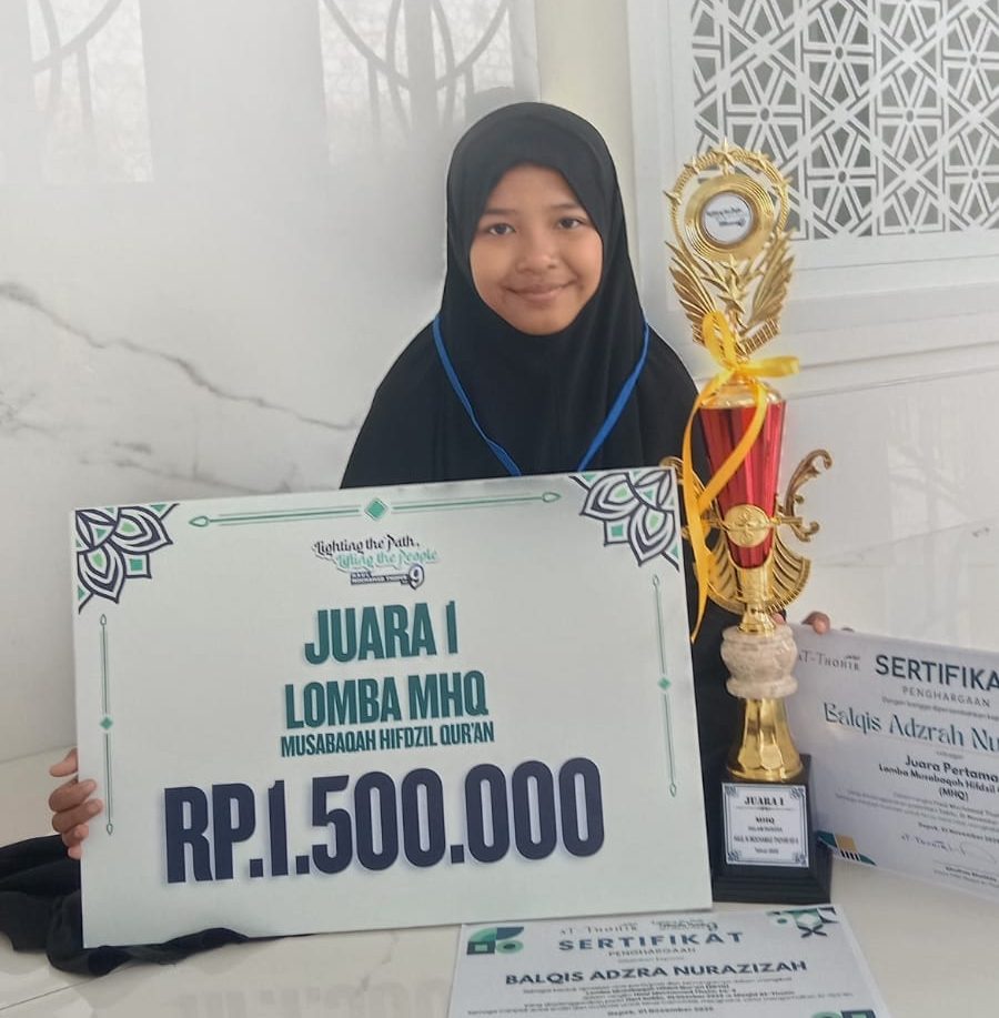 Dalam ajang Hifdzul Qur’an Contest (MHQ) yang digelar di Masjid At-Thohir, Sabtu (1/11/2025), Balqis berhasil meraih Juara 1 kategori Musabaqoh Hifdzil Qur’an (MHQ) Juz 30 tingkat SD/MI se-Jabodetabek.