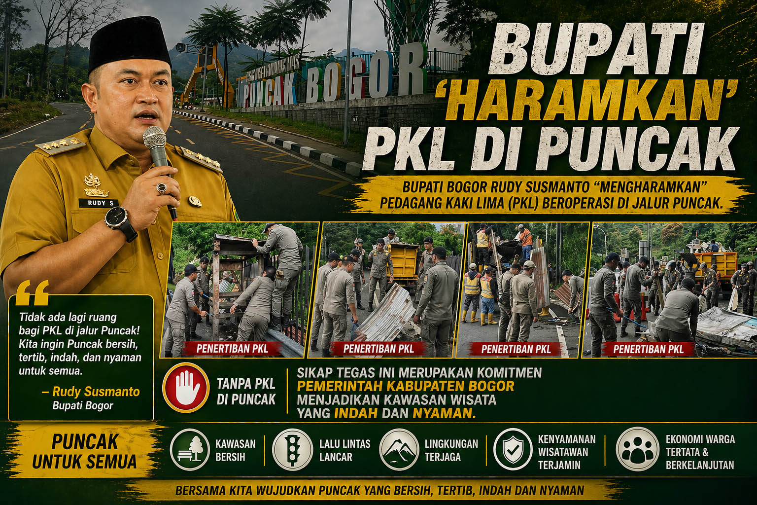 jurnalbogor.com – Bupati Bogor Rudy Susmanto “mengharamkan” pedagang kaki lima (PKL) beroperasi di jalur Puncak. Sikap tegas ini merupakan komitmen Pemerintah Kabupaten Bogor menjadikan kawasan wisata yang indah dan nyaman.