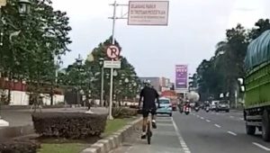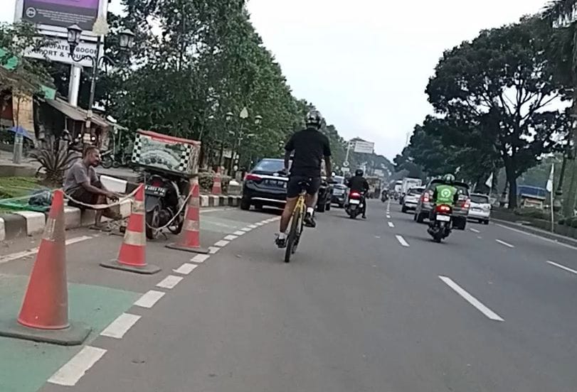 Bagas (22), warga Sentul City terekam kamera saat mengayuh sepedanya keluar dari lintasan jalur sepeda di depan restoran ternama ke arah bundaran Tugu Pancarkarsa.