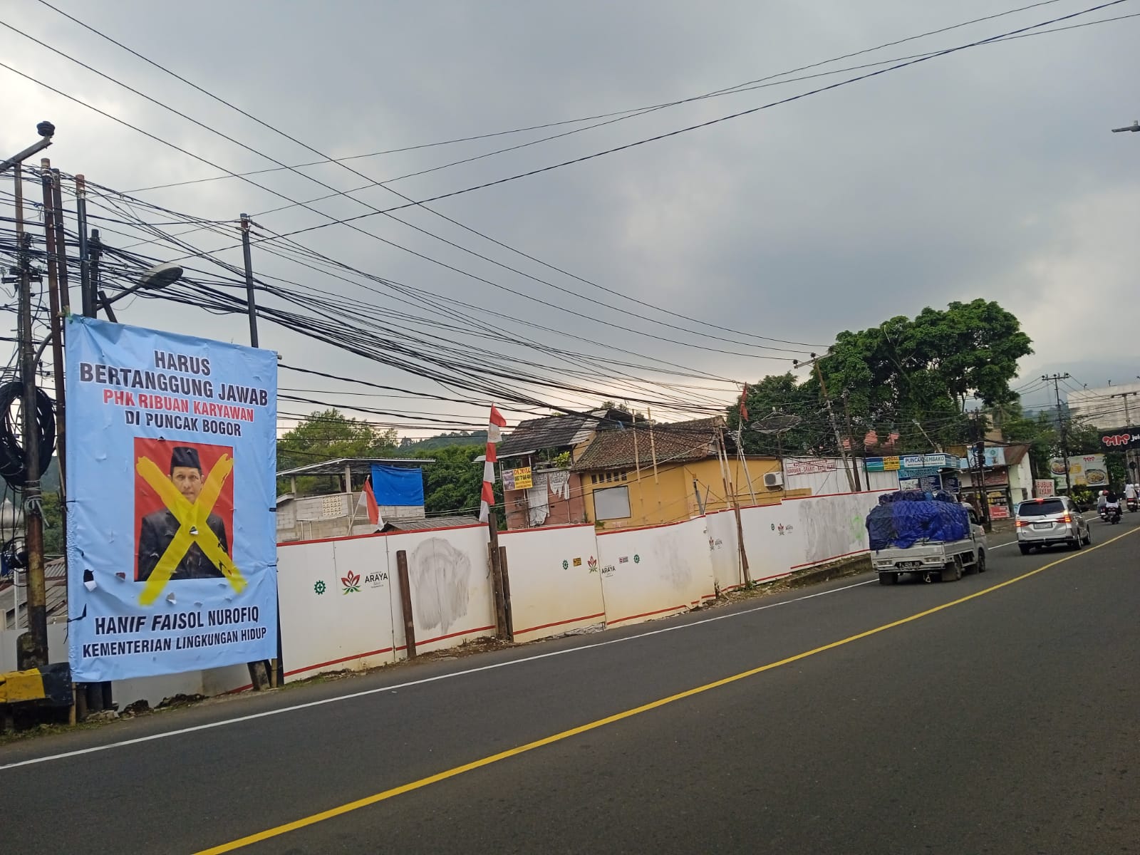 Pantauan di lapangan di sepanjang jalur Puncak dan di beberapa wilayah di Kabupaten Bogor, baliho baliho penolakan terhadap menteri KLH Faisol Hanafi terpasang di pinggir pinggir jalan.