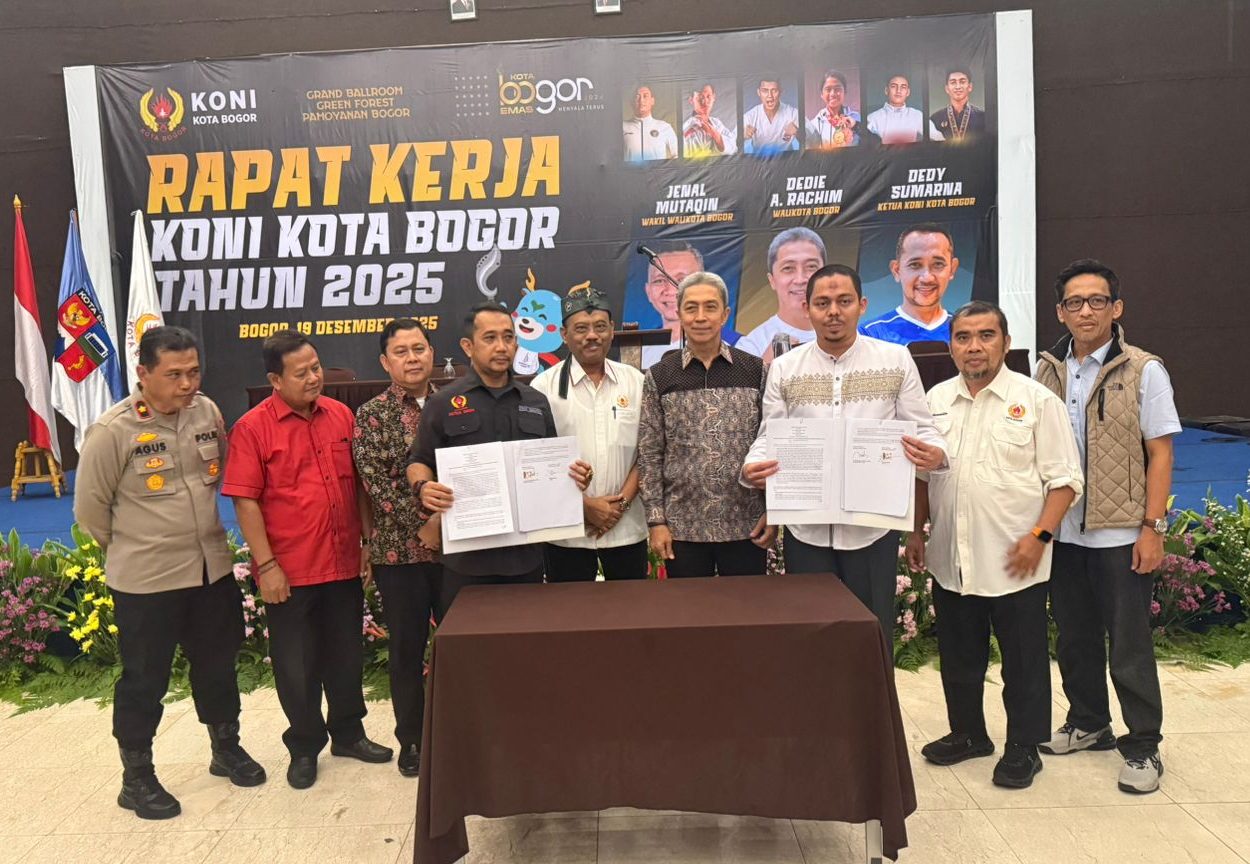 jurnalbogor.com – Jelang perhelatan Pekan Olahraga Provinsi (Porprov) Jawa Barat (Jabar) 2026, KONI Kota Bogor menandatangani Memorandum of Understanding (MoU) dengan Rumah Sakit (RS) Ummi dan Universitas Ummi saat Rapat Kerja KONI Kota Bogor di Hotel Green Forest, Kelurahan Pamoyanan, Kecamatan Bogor Selatan, Jumat (19/12/2025).
