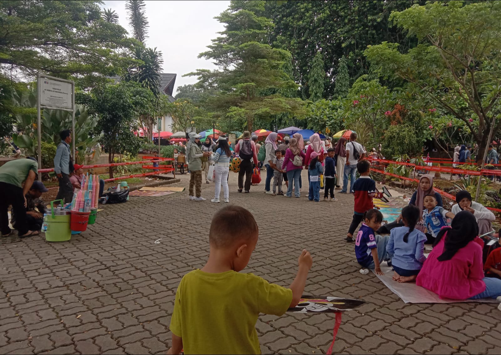 Sejumlah warga tampak duduk santai di area taman, sementara anak-anak berlarian di sekitar area bermain. Di sisi lain, para pedagang kaki lima menjajakan berbagai makanan dan minuman ringan. Suasana terasa hidup dengan suara tawa anak-anak dan obrolan pengunjung yang berseliweran di antara pepohonan rindang.